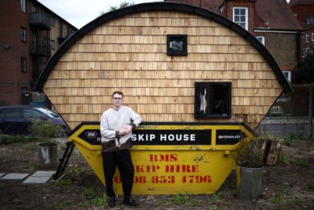 LONDON (Reuters) – An artist has built a home in a rubbish skip in London and plans to live in it for a year, seeking to draw attention to the “crazy” price of renting a room in Britain’s capital during a cost of living crisis.