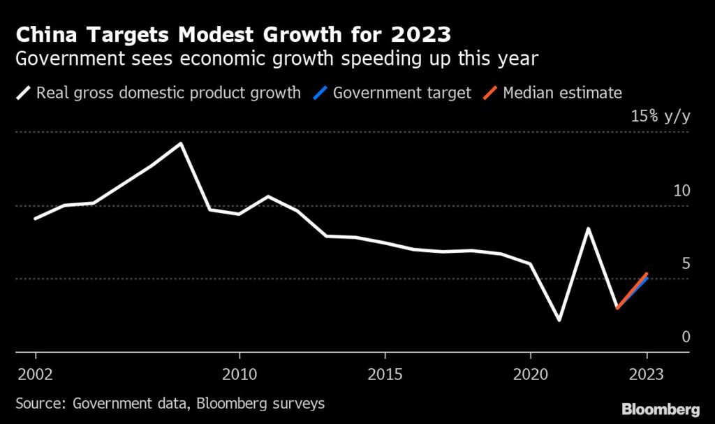 (Bloomberg) — China set a modest economic growth target of around 5% for the year, with the nation’s top leaders avoiding any large stimulus to spur a consumer-driven recovery already underway, suggesting less of a growth boost to an ailing world economy.