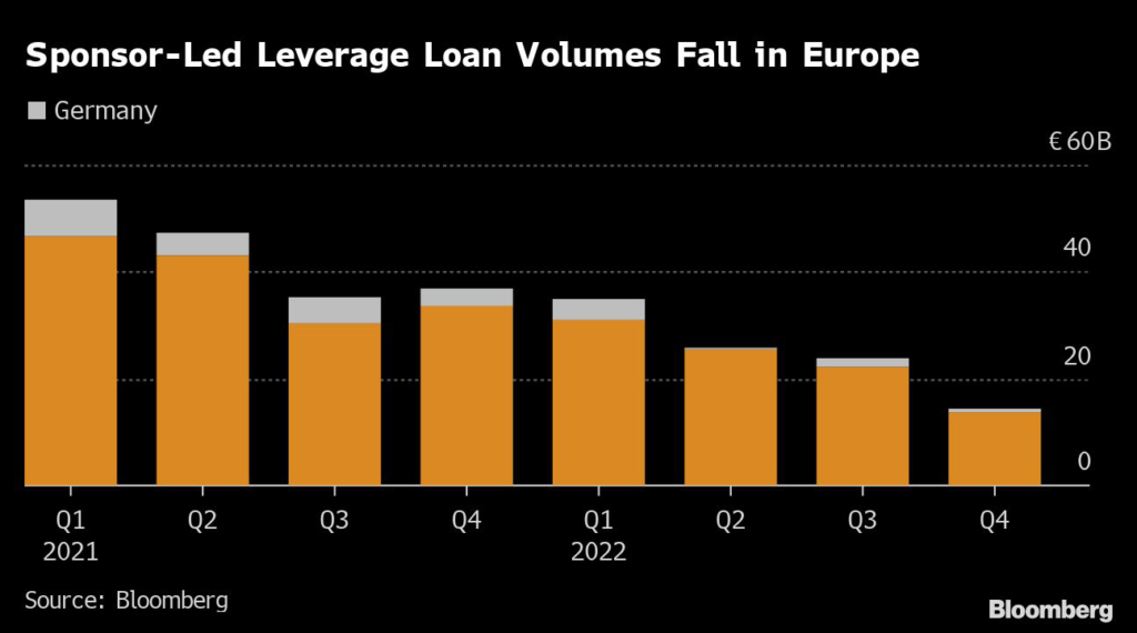 This kept at least a small financing channel open in 2022, a year in which the value of loans issued to back private equity deals in Germany fell 65% to €6.6 billion, data compiled by Bloomberg show.