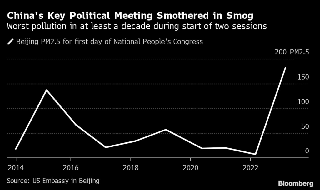 (Bloomberg) — In a sharp departure from the blue skies that typically glisten for Beijing’s landmark events, the start of this year’s parliamentary session has been marked by smog, with the annual meeting suffering its worst air quality in at least a decade.