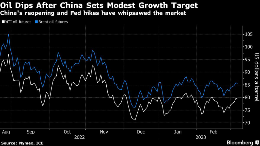 Oil was pressured by China’s latest economic growth goal that was lower than economists projected, suggesting that a boost in the nation’s crude consumption will be smaller than the bulls had hoped for.