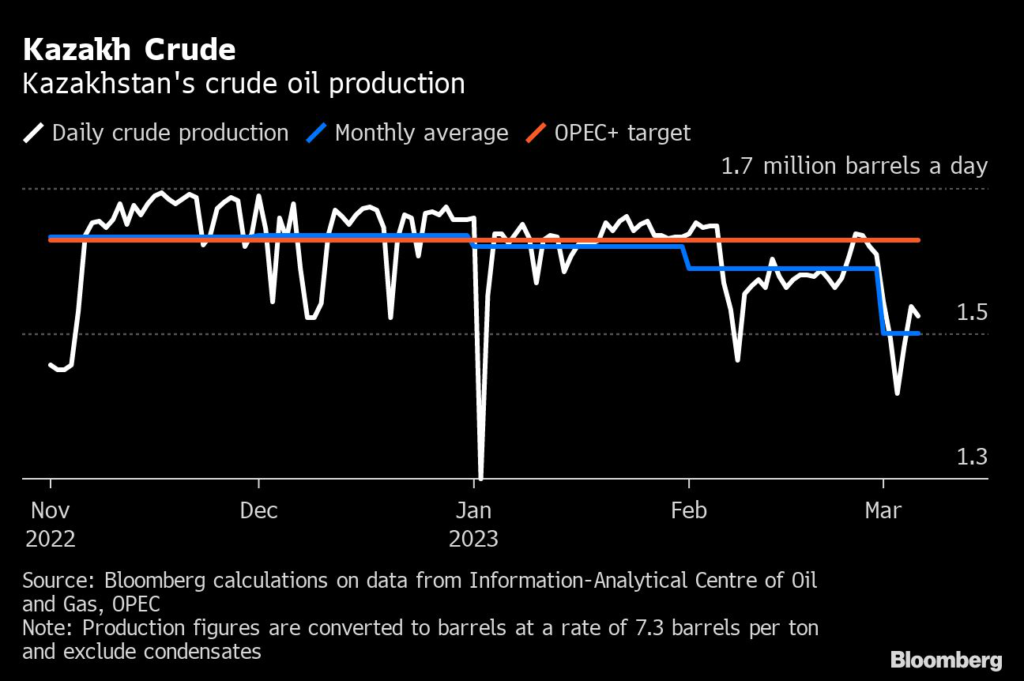 Kazakhstan’s oil production has dropped by about 100,000 barrels a day since late February, according to daily data from the government.