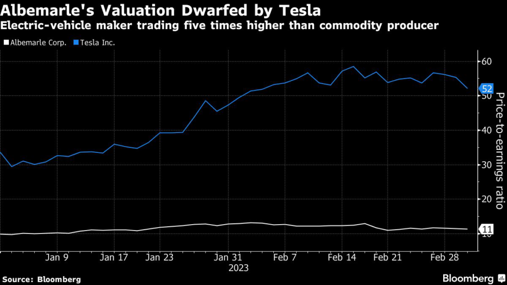 Albemarle Corp. — the largest producer of the metal — has seen sales and income surge. Still, the stock trades at a roughly 11-times price to earnings multiple — below the 14.8-times multiple of the S&P 500 Materials Index and just a fraction of Tesla’s 56-times multiple.