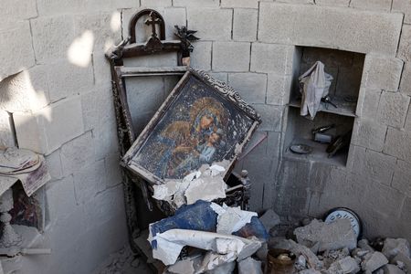 The floor is also covered by rubble from the collapsed roof, while several paintings of Jesus and the saints hang slanted and covered in dust and mud on the walls.