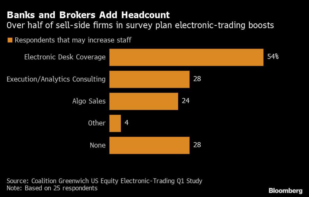 (Bloomberg) — Banks and broker-dealers are planning to add headcount in equities electronic-trading roles, bucking the trend in other Wall Street businesses where workforces are being cut.