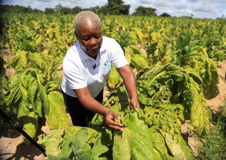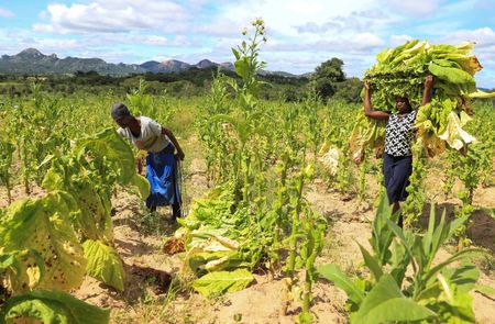 HARARE (Reuters) – As the sweltering morning sun beat down on them, about half a dozen young Zimbabwean women stacked green tobacco leaves into sheaves while another group, some with babies on their backs, loaded the harvested crop onto a tractor.