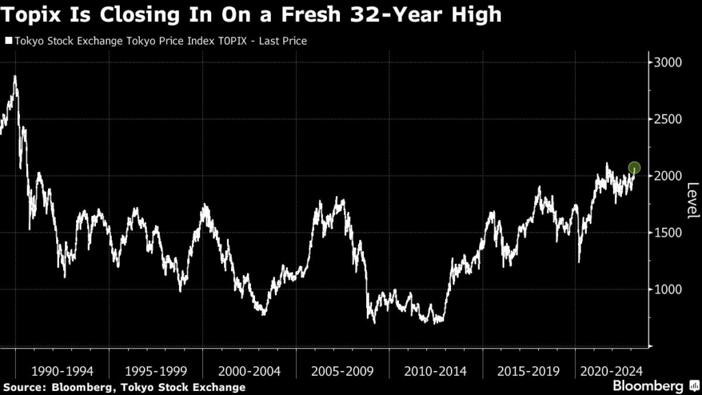 (Bloomberg) — A surprise from Bank of Japan Governor Haruhiko Kuroda at the last policy meeting before his term ends may be the only thing that could stop the nation’s benchmark equity index from climbing to a more than three-decade high in the near future.