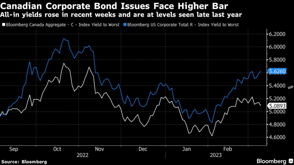 Bond sales from Canadian firms in the first eight days of the month reached almost $21 billion, up from over $11 billion in all of February, according to data compiled by Bloomberg.