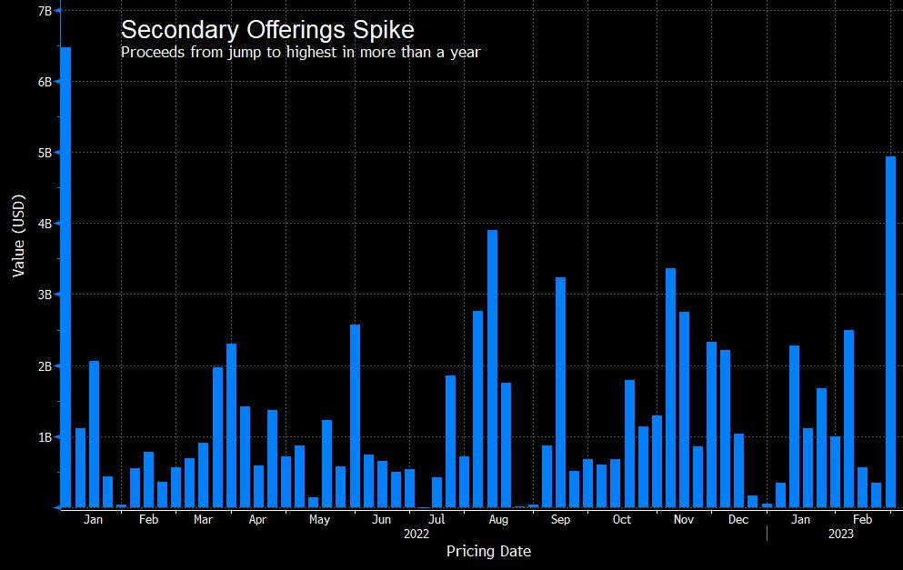 During this month’s pickup, about 55% of proceeds have gone to top holders rather than corporate issuers. In 2022, basically none of the proceeds went to big shareholders, and in 2021 the figure was around 20%.