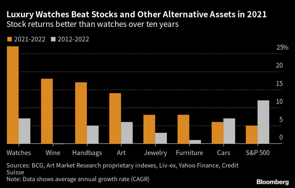 The S&P 500 had a compound annual growth rate of 12% between 2012 and 2022, while Rolex, Patek and AP watches averaged 7%.