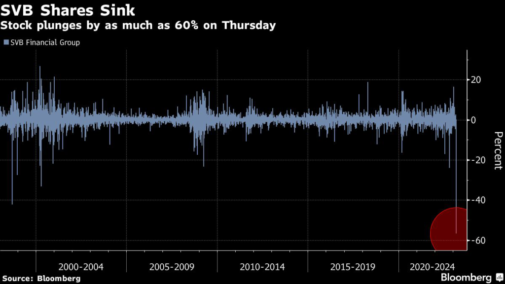 SVB’s shares sank 60% on Thursday, closing at their lowest level since September 2016, erasing $9.6 billion in market value.