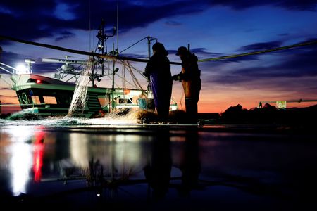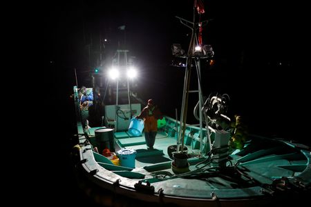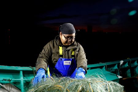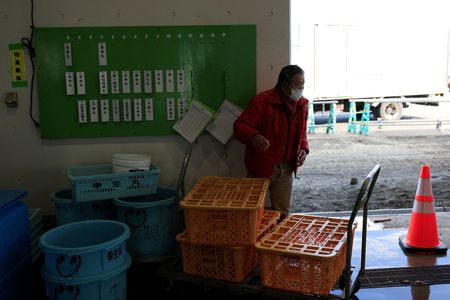 SHINCHIMACHI, Japan (Reuters) – A chilly dawn paints the sky magenta and purple as Japanese fisherman Haruo Ono unloads his catch of flounder, crab and sea bass from his boat at the small port of Shinchimachi.