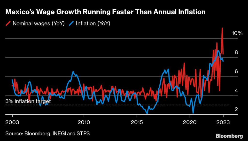 (Bloomberg) — Mexico nominal wages rose at a faster pace than consumer price increases for a fourth month in February, presenting an upside risk to the inflation outlook in Latin America’s second-biggest economy.