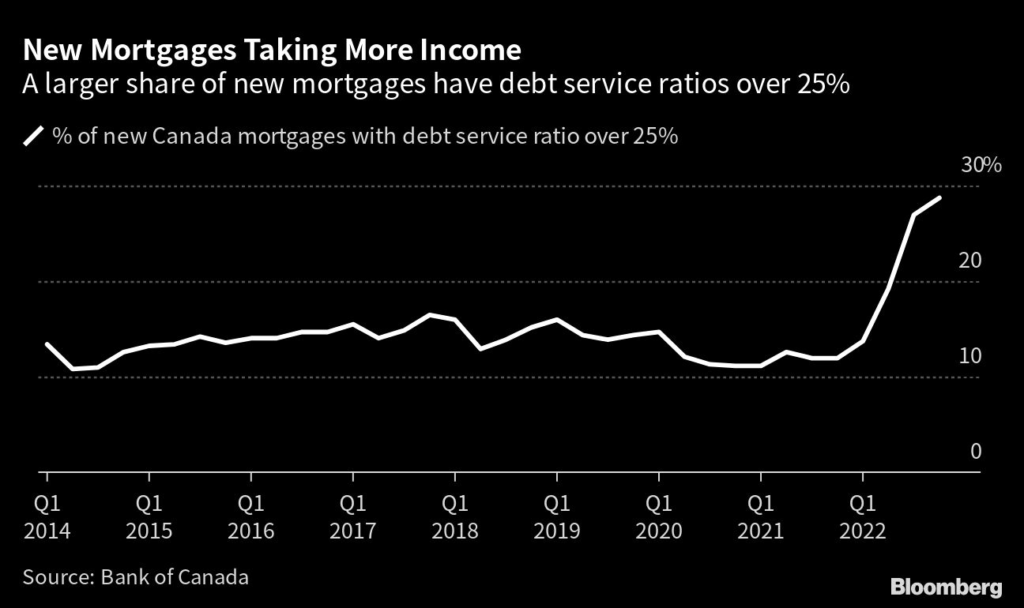Nearly 29% of new mortgages had a debt service ratio greater than 25% in the fourth quarter, up from about 12% a year earlier, according to the data released Friday by the Bank of Canada.