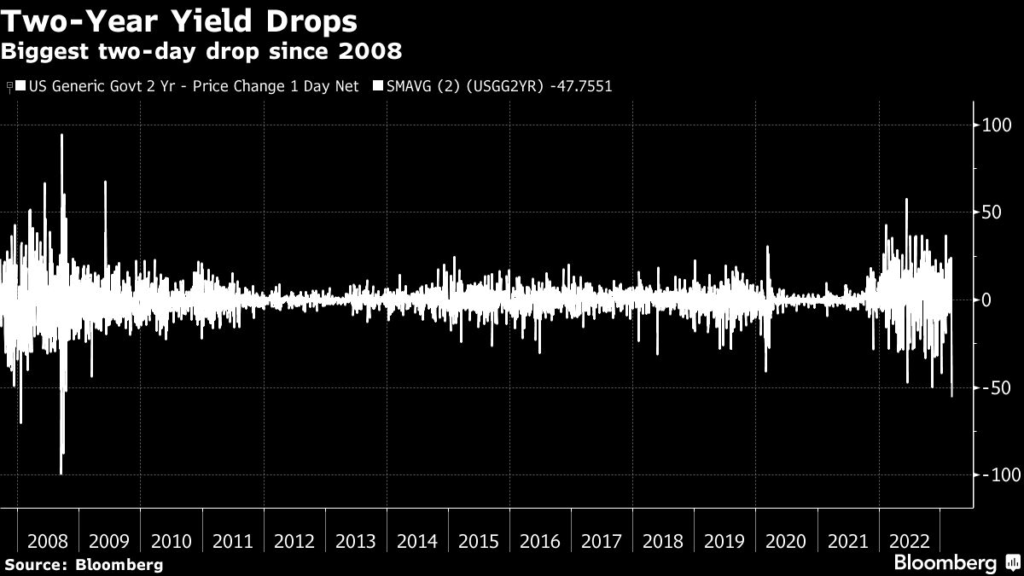 That lead to the two-year Treasury yield’s biggest two-day drop since 2008, after breaking through 5% for the first time since 2007 earlier in the week.