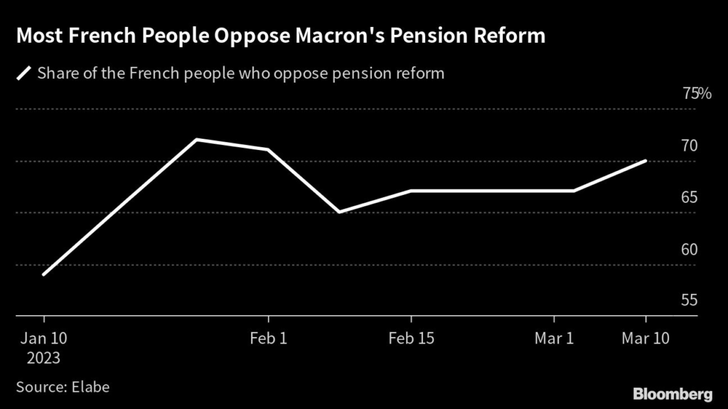 (Bloomberg) — Fewer French people took to the streets for the seventh day of protests against the contentious pension reform of President Emmanuel Macron, even as a growing majority opposes the overhaul.