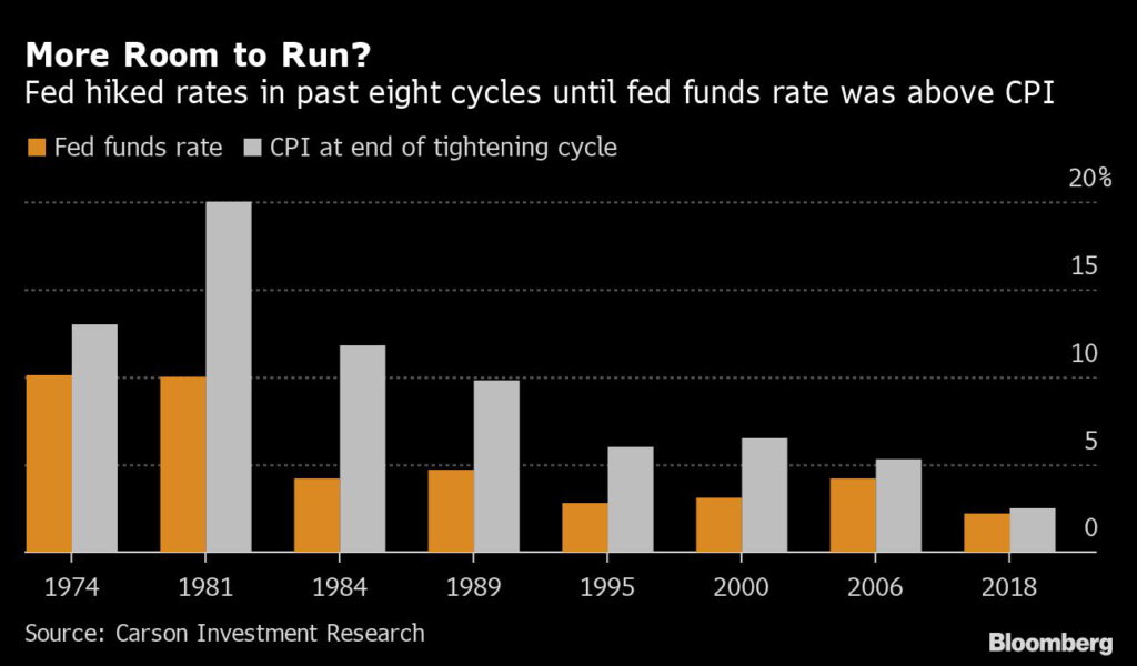 The past eight hiking cycles saw the Fed continue to lift its benchmark until it was above CPI, according to Carson Investment Research.