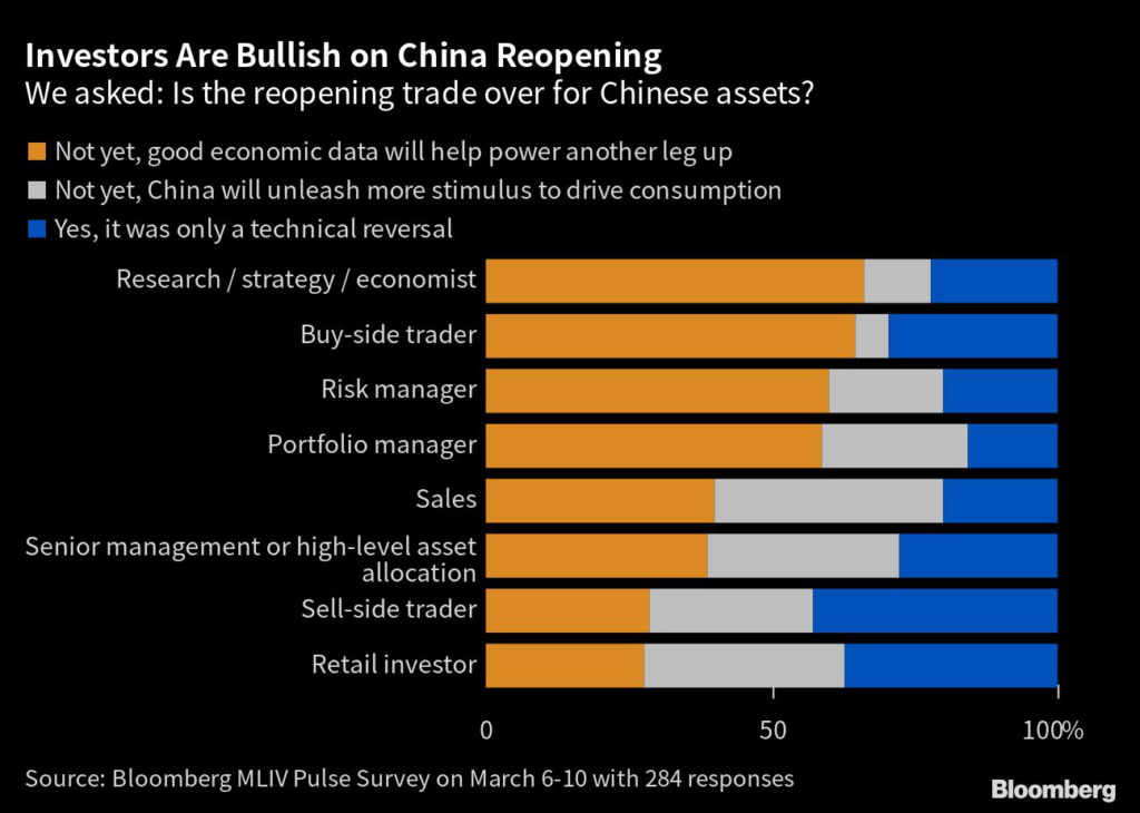 Some 44% also expect the country to beat its 5% economic growth target this year, supporting “reopening trade” bets on China’s successful emergence from almost three years of draconian pandemic restrictions.