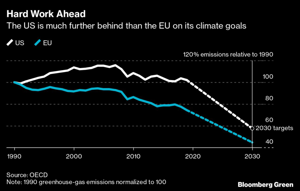 He sees the EU’s long-running embrace of carbon pricing and stricter rules on green investments, alongside established financial incentives for clean technologies, giving the bloc an advantage in the shared push to curb greenhouse gas.