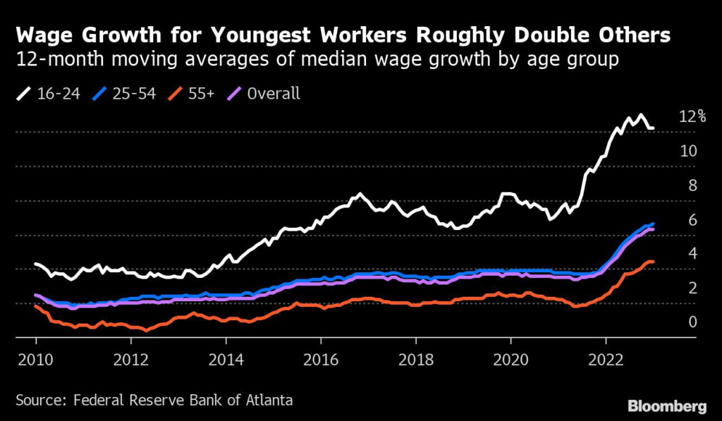 US workers ages 16 to 24 are the only group that’s seen pay gains consistently outpace the consumer price index throughout the pandemic, according to data from the Federal Reserve Bank of Atlanta.