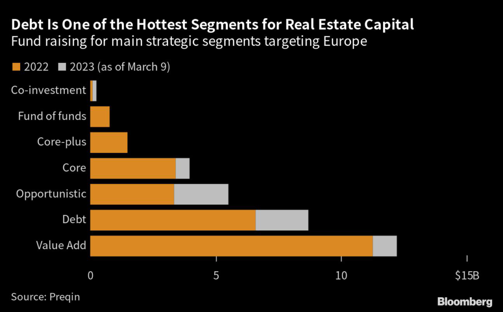 Since last year, pension funds, insurers and private equity firms have accumulated more than $8 billion to invest in European real estate debt, making it the second most popular bet in the sector, according to data from research firm Preqin.