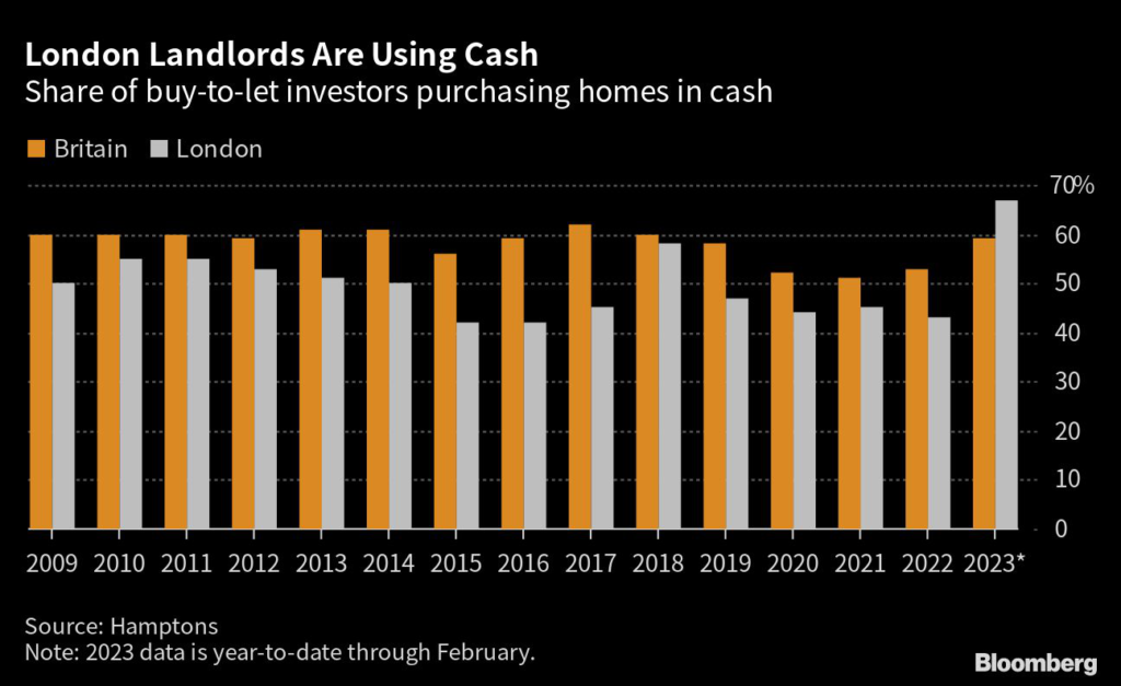 The share of buy-to-let homes bought with cash in London has risen to 67% so far this year, compared with 43% in 2022, according to a report from broker Hamptons International.