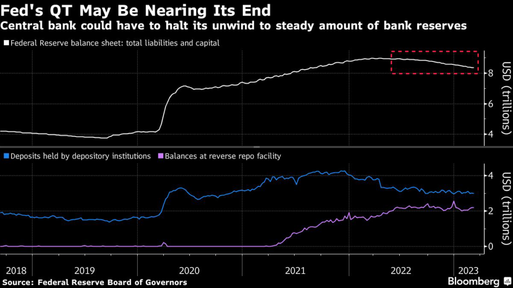 (Bloomberg) — The Federal Reserve may need to end its quantitative-tightening program early to preserve the amount of bank reserves in the financial system while also maintaining its hawkish signaling on interest rates, according to Citigroup Inc.