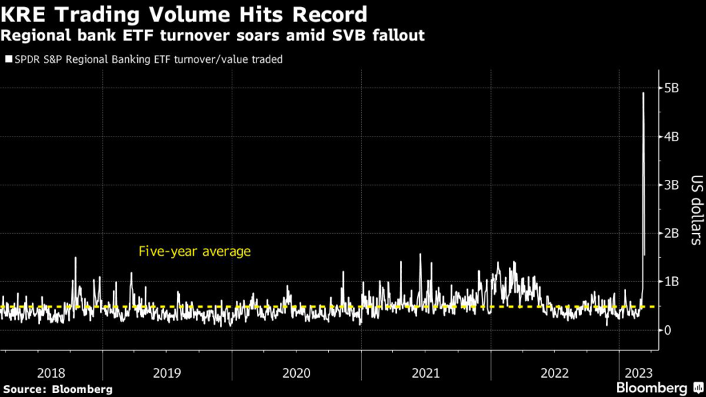 KRE trading volume hit a record $4.9 billion on Friday, followed by another $4.2 billion traded on Monday, ranking it among the day’s 10 most-traded ETFs. That compares to average trading volume of about $486 million over the past five years.