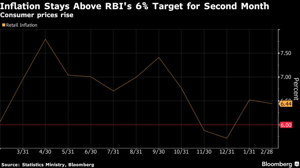 Consumer prices rose 6.44% in February, breaching the Reserve Bank of India’s target ceiling as well as analysts’ expectations for a second straight month.