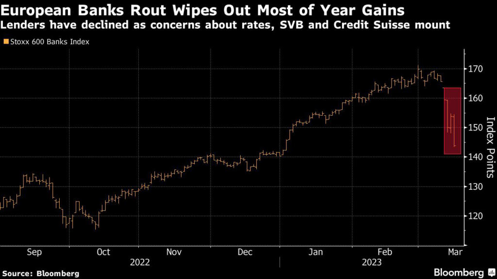 (Bloomberg) — Investors betting on a further outperformance in European bank stocks in 2023 have been caught wrong footed by the meltdown in shares of Credit Suisse Group AG and fears of a recession.