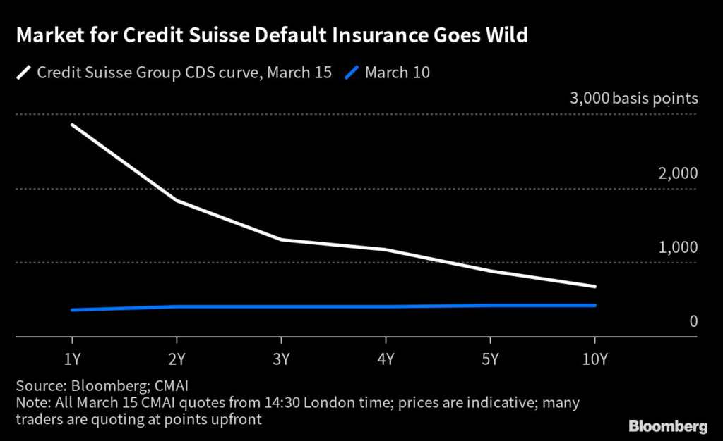 The price of Credit Suisse’s one-year credit default swaps jumped as of afternoon in London, with other lenders looking to protect themselves from the fallout.