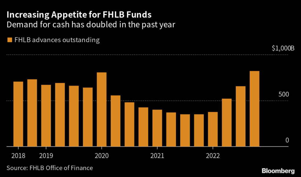 The total amount of advances to members, which is published quarterly, had already more than doubled to $819 billion last year as increased Fed interest rates helped put pressure on deposits and this latest episode may push them higher still.