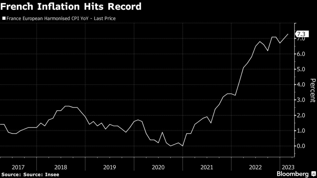Consumer prices jumped 7.3% from a year ago, the strongest surge for France in the history of the euro area.