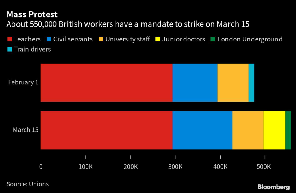 (Bloomberg) — About half a million British workers are striking on Wednesday as unions stage a mass walkout timed to disrupt Chancellor of the Exchequer Jeremy Hunt’s annual budget.