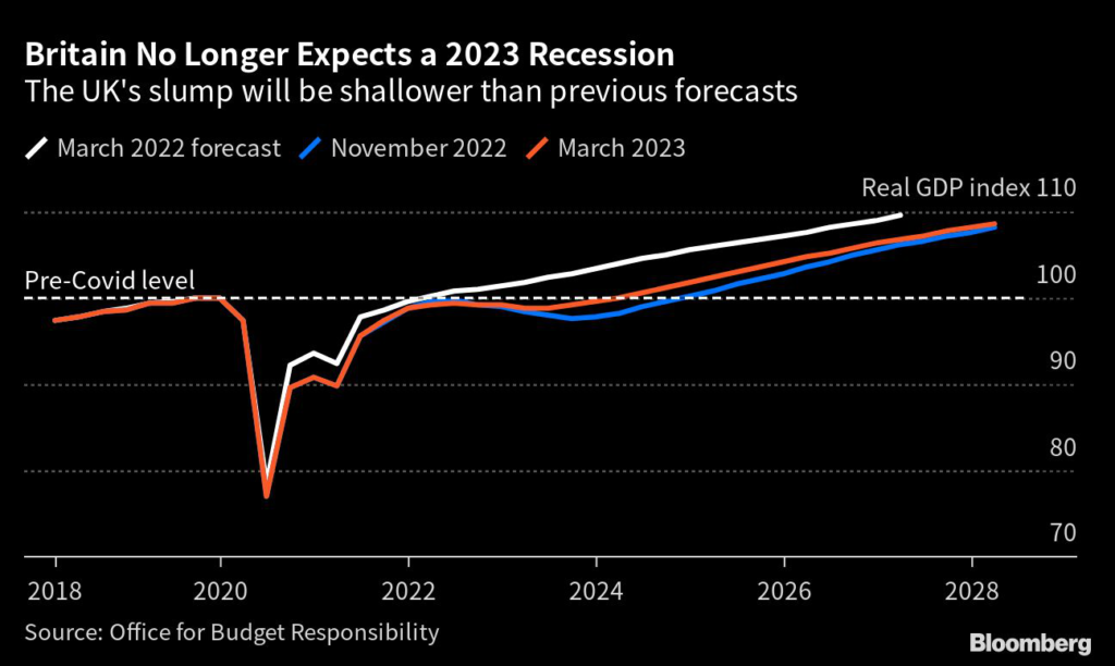 In its revised forecast announced by Hunt, the UK is set to avoid a technical recession this year even as the economy shrinks 0.2%. The OBR expects the economy will return to 1.8% growth next year — when Britons go to the polls — and hit 2.5% in 2025.