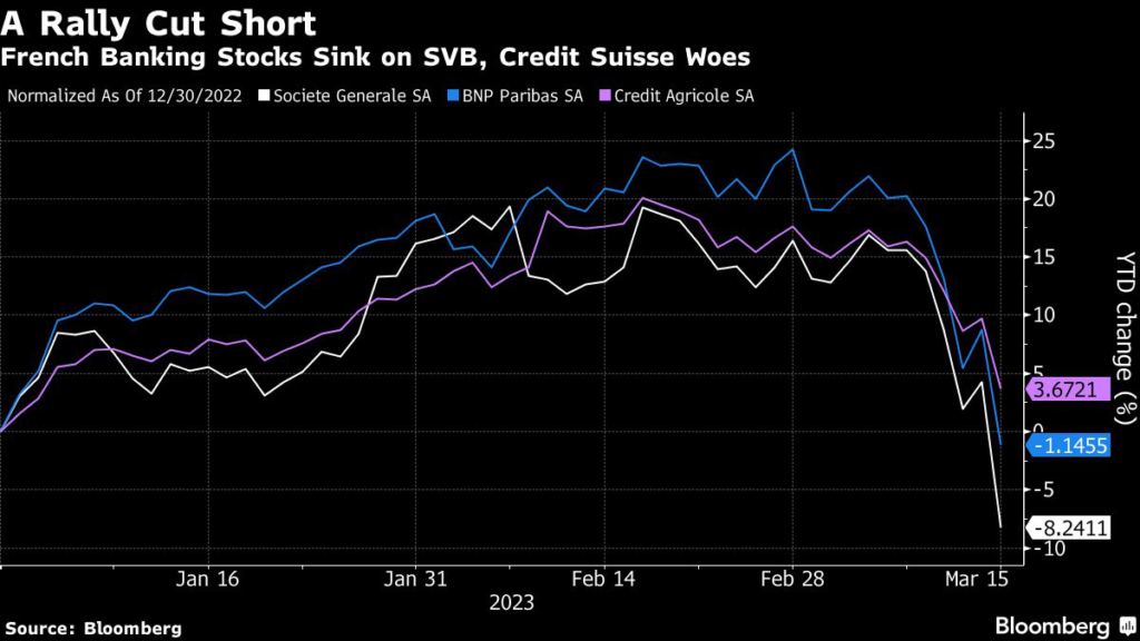 French banking stocks, which have sunk in recent days, fell further on concerns around Credit Suisse after its biggest shareholder said it was absolutely not open to further cash injections in the Swiss lender.