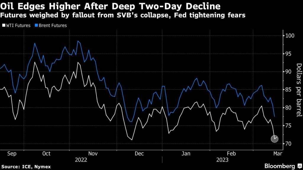 The US benchmark plunged more than 5% Tuesday, plagued by banking-sector turmoil that’s eroding oil-demand optimism.