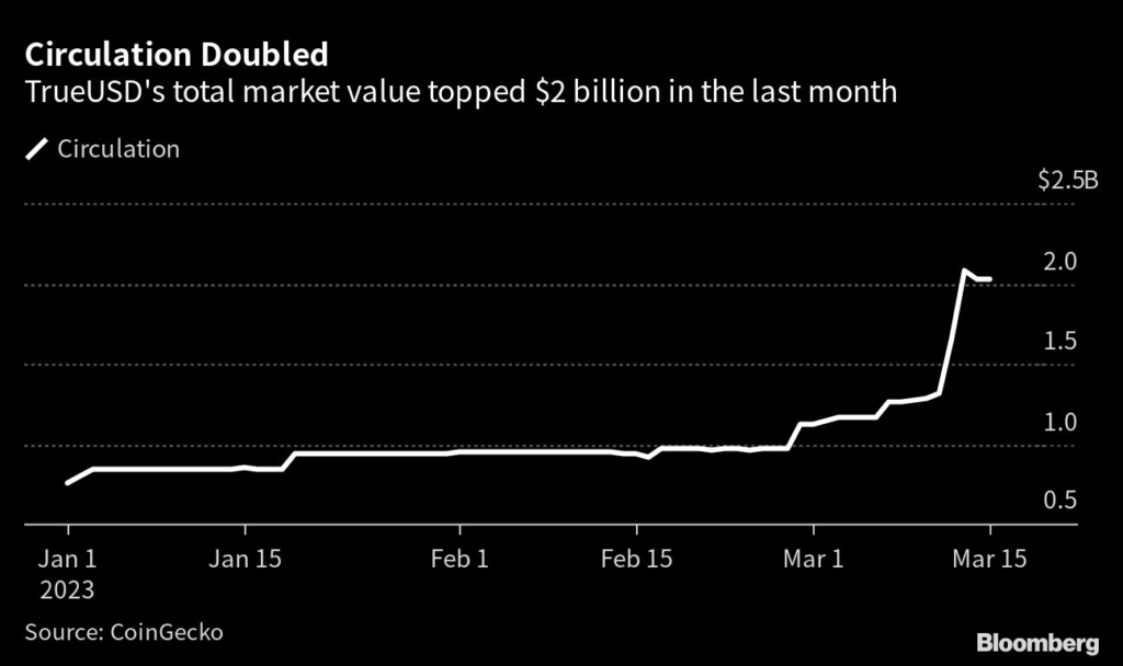 TrueUSD has more than doubled its circulation in the past month after rival stablecoin BUSD, a token branded by the world’s largest exchange Binance, was forced to close by New York regulators in February.