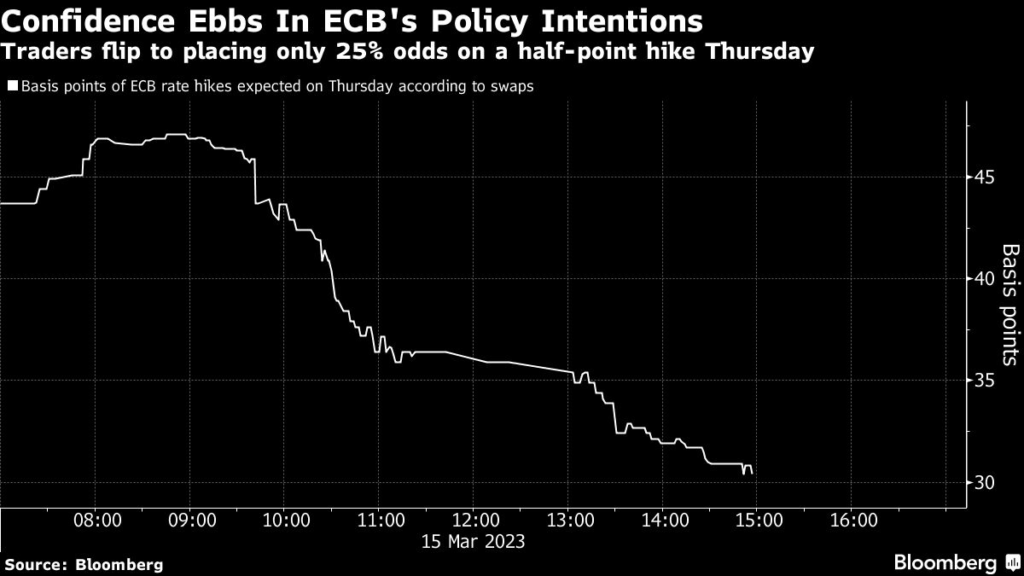 Traders are betting Christine Lagarde will pay heed to banking turmoil and not deliver on a promised half-point rate hike when the European Central Bank announces its policy decision Thursday.