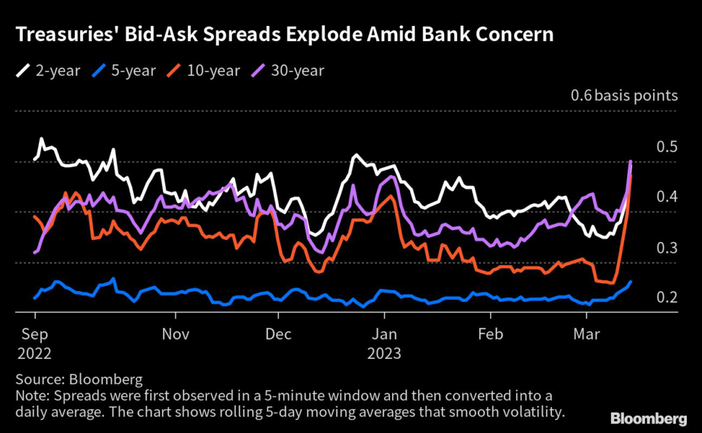 (Bloomberg) — Liquidity in the world’s largest bond market is evaporating as the US banking crisis muddies the outlook for the Federal Reserve’s monetary policy.