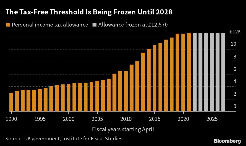 Freezing income tax and National Insurance thresholds will raise an extra £29 billion a year in taxes by 2027/28, relative to if the thresholds had not been frozen, according to OBR calculations.