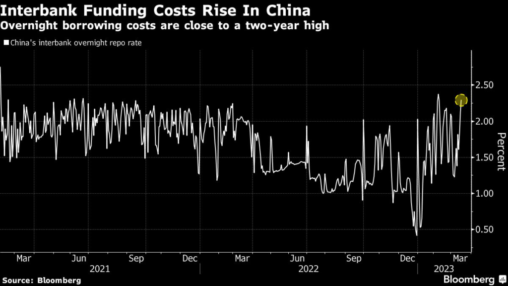 The climb in borrowing costs may add to jitters on Chinese assets as fears from a nascent banking crisis spread through global markets.