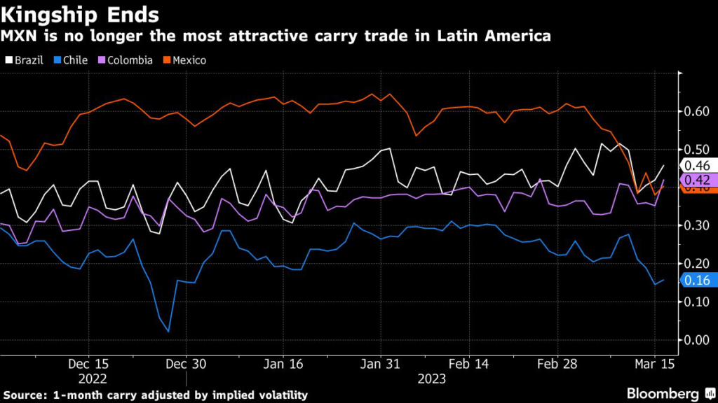 The undoing of the peso comes from the turmoil in global banking that has pushed one-month implied volatility on the currency to 17.2%, the highest in more than two-and-a-half years.