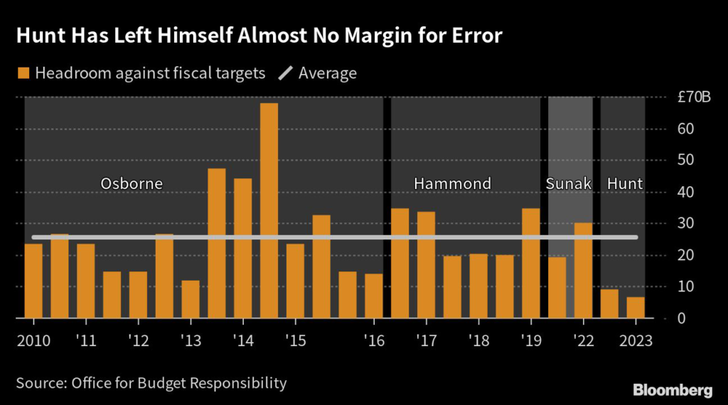 Hunt hit his own rule for debt to be falling as a share of GDP in 2027-28 with just £6.5 billion ($7.9 billion) to spare, the smallest margin since the UK’s fiscal framework was established with the creation of the Office for Budget responsibility in 2010.