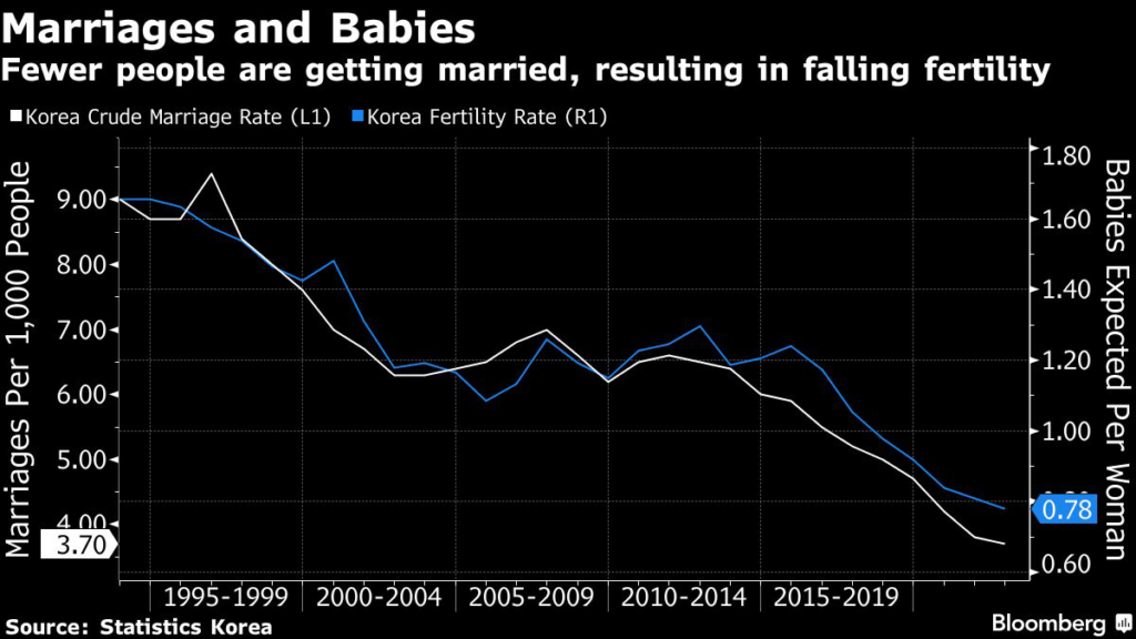 (Bloomberg) — South Korean marriages fell to a new record low last year, auguring a further downshift in the country’s dismal fertility rate.