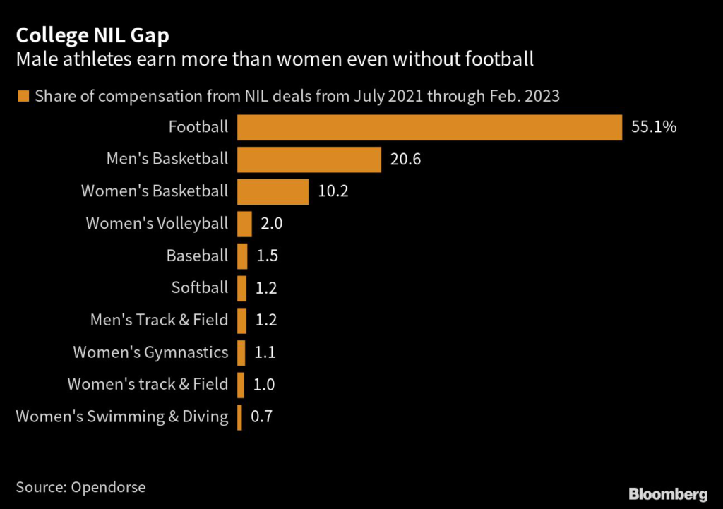 According to the data, most of the men’s earnings edge comes from football, which by itself accounted for 55.1% of NIL deals. Even without football players in the dataset, Opendorse found that men take in roughly 60% of the compensation from NIL deals.