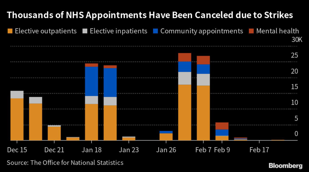 The proposal for National Health Service workers includes a one-time bonus worth 2% of salary for 2022-23, along with an “NHS backlog bonus” worth at least £1,250 per person, the Department of Health and Social Care said in an emailed statement.