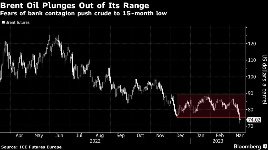 Oil tumbled to a 15-month low amid a banking crisis that’s expanded to Credit Suisse Group AG and rippled through markets after trading in a relatively narrow range, but the warning signs have been building for much longer.