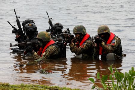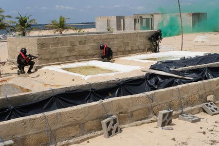 The sea-based training in the first half of March culminated with soldiers holding their guns aloft as they braved neck-high waves before storming a beach resort to defuse a staged hostage crisis.