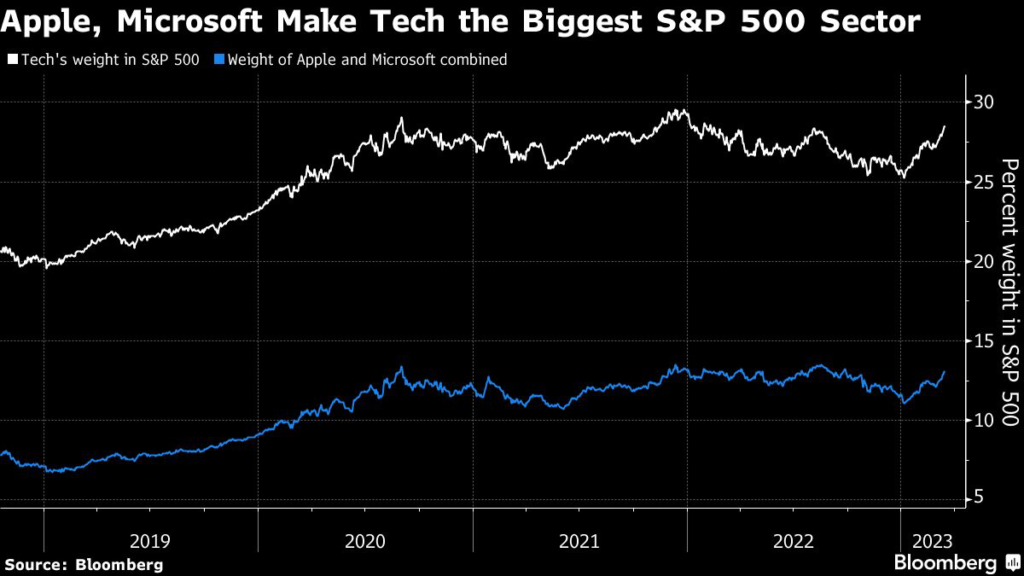 It accounts for 29% of the S&P 500, its highest in more than a year, and up from a January low of 25.3%. It is twice as influential as health care, the second-largest, which is 14% of the benchmark.